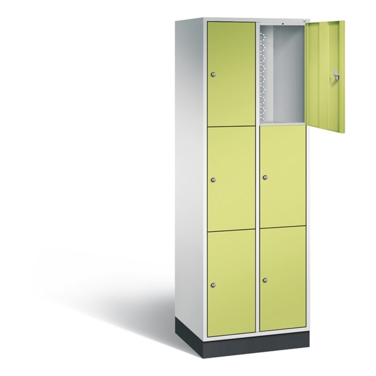 Stahl-Schließfachschrank Intro, 2 Abteile mit 3 Fächern, Abteilbreite 300 mm, Korpus aus stabiler Stahlkonstruktion mit hochwertiger Einbrennbeschichtung für hohe UV- und Korrosionsbeständigkeit, Türen verstärkt für hohe Stabilität, mit Anschlagsdämpfer, Türaufhängung durchgängig mit robustem Scharnierband, rechts angeschlagen, Rückwand mit großflächigem Luftdurchlass und 18 mm Wandabstandshaltern, auf 100 mm hohem Sockel, 6 Zylinderschlösser mit je 2 Schlüsseln, Schließkreis bis 1000 verschiedene Schließungen, Maße (H x B x T): 1950 x 620 x 490 mm, Korpus: RAL 7035 Lichtgrau, Türen: 1108060 RDS Viridingrün, Sockel: RAL 7021 Schwarzgrau