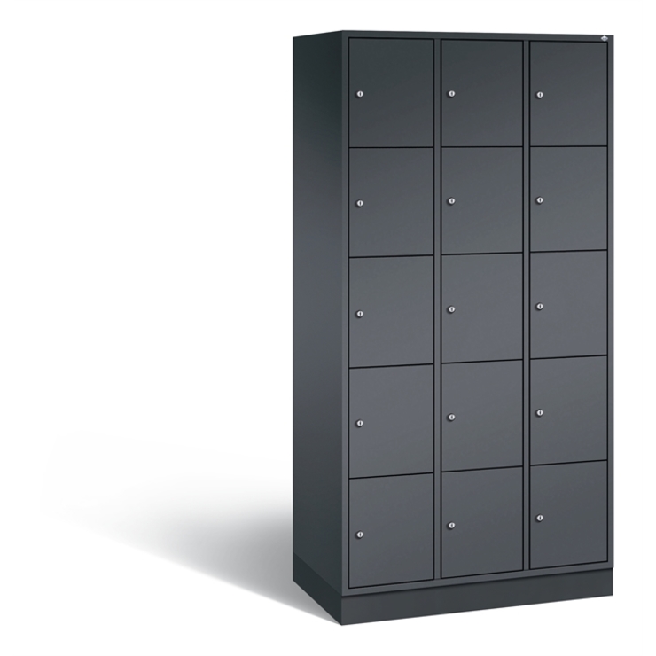Stahl-Schließfachschrank Intro, 3 Abteile mit 5 Fächern, Abteilbreite 300 mm, Korpus aus stabiler Stahlkonstruktion mit hochwertiger Einbrennbeschichtung für hohe UV- und Korrosionsbeständigkeit, Türen doppelwandig für hohe Stabilität, mit Anschlagsdämpfer, Türaufhängung durchgängig mit robustem Scharnierband, rechts angeschlagen, Rückwand mit großflächigem Luftdurchlass und 18 mm Wandabstandshaltern, auf 100 mm hohem Sockel, 15 Zylinderschlösser mit je 2 Schlüsseln, Schließkreis bis 1000 verschiedene Schließungen, Maße (H x B x T): 1950 x 920 x 490 mm, Korpus: RAL 7021 Schwarzgrau, Türen: RAL 7021 Schwarzgrau, Sockel: RAL 7021 Schwarzgrau