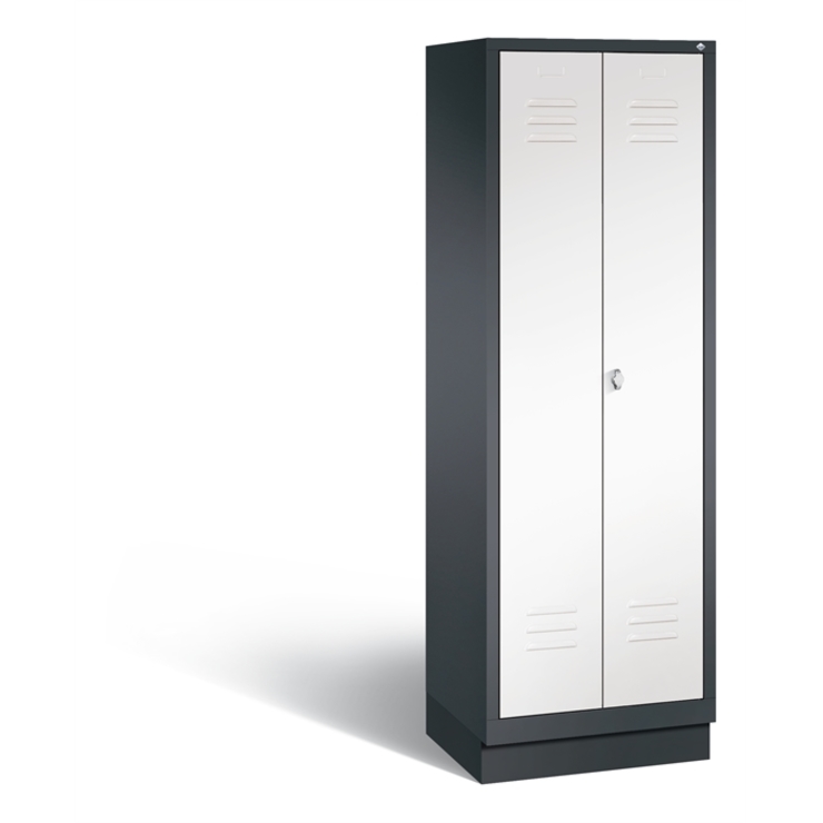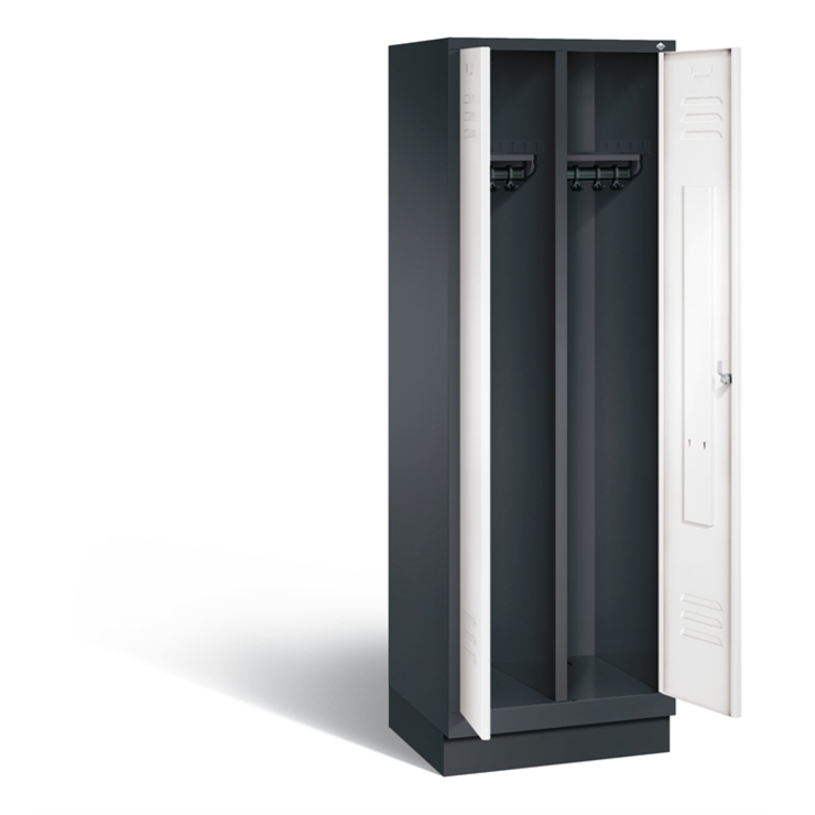 Stahl-Garderobenschrank Classic, als Straßen- und Berufskleidungsschrank 2 Abteile für 1 Person, Abteilbreite 300 mm, Türen zueinanderschlagend für gemeinsamen Verschluss, Korpus aus stabiler Stahlkonstruktion mit hochwertiger Einbrennbeschichtung für hohe UV- und Korrosionsbeständigkeit, innen je Abteil 1 Ablageboden, darunter 1 stabile Garderobenstange aus Ovalprofil mit 3 verdrehsicheren Schiebehaken, Schrankboden hinten mit Lüftungsöffnungen für optimale Luftzirkulation, auf 100 mm hohem Sockel, mit Kunststoffgleitern als praktischer Schrank- und Fußbodenschutz, vorne zurückgesetzt und oberhalb mit Luftdurchlass, 1 Drehriegel für Vorhangschloss, Türen mit Anschlagsdämpfer und mittiger Verstärkung für hohe Stabilität, mit Lüftungschlitzen oben und unten sowie eingestanztem Etikettenrahmen, Türaufhängung in Drehbolzen, Maße (H x B x T): 1800 x 610 x 500 mm, Korpus: RAL 7021 Schwarzgrau, Türen Stahl: RAL 9016 Verkehrsweiß, Inneneinrichtung: RAL 7021 Schwarzgrau