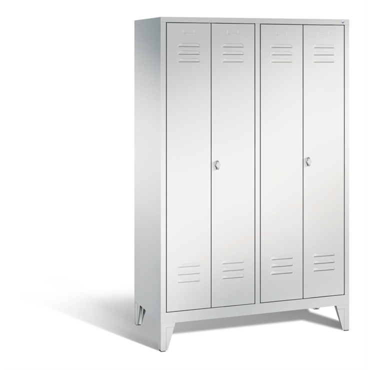 Stahl-Garderobenschrank Classic, als Straßen- und Berufskleidungsschrank 4 Abteile für 2 Personen, Abteilbreite 300 mm,Türen paarweise zueinanderschlagend für gemeinsamen Verschluss, Korpus aus stabiler Stahlkonstruktion mit hochwertiger Einbrennbeschichtung für hohe UV- und Korrosionsbeständigkeit, innen je Abteil 1 Ablageboden, darunter 1 stabile Garderobenstange aus Ovalprofil mit 3 verdrehsicheren Schiebehaken, Schrankboden hinten mit Lüftungsöffnungen für optimale Luftzirkulation, auf 150 mm hohen Füßen aus Kunststoff für erweiterten Korrosionsschutz, 2 Drehriegel für Vorhängeschlösser, Türen mit Anschlagsdämpfer und mittiger Verstärkung für hohe Stabilität, mit Lüftungschlitzen oben und unten sowie eingestanztem Etikettenrahmen, Türaufhängung in Drehbolzen, Maße (H x B x T): 1850 x 1190 x 500 mm, Korpus: RAL 7035 Lichtgrau, Türen Stahl: RAL 7035 Lichtgrau, Inneneinrichtung: RAL 7035 Lichtgrau, Füße: RAL 7035 Lichtgrau