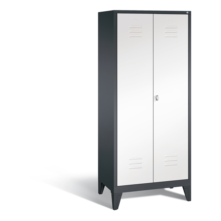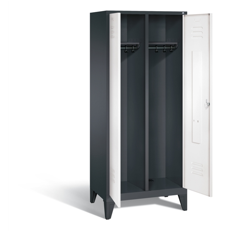 Stahl-Garderobenschrank Classic, als Straßen- und Berufskleidungsschrank 2 Abteile für 1 Person, Abteilbreite 400 mm, Türen zueinanderschlagend für gemeinsamen Verschluss, Korpus aus stabiler Stahlkonstruktion mit hochwertiger Einbrennbeschichtung für hohe UV- und Korrosionsbeständigkeit, innen je Abteil 1 Ablageboden, darunter 1 stabile Garderobenstange aus Ovalprofil mit 3 verdrehsicheren Schiebehaken, Schrankboden hinten mit Lüftungsöffnungen für optimale Luftzirkulation, auf 150 mm hohen Füßen aus Kunststoff für erweiterten Korrosionsschutz, 1 Drehriegel für Vorhangschloss, Türen mit Anschlagsdämpfer und mittiger Verstärkung für hohe Stabilität, mit Lüftungschlitzen oben und unten sowie eingestanztem Etikettenrahmen, Türaufhängung in Drehbolzen, Maße (H x B x T): 1850 x 810 x 500 mm, Korpus: RAL 7021 Schwarzgrau, Türen Stahl: RAL 9016 Verkehrsweiß, Inneneinrichtung: RAL 7021 Schwarzgrau, Füße: RAL 9005 Tiefschwarz