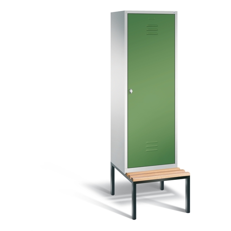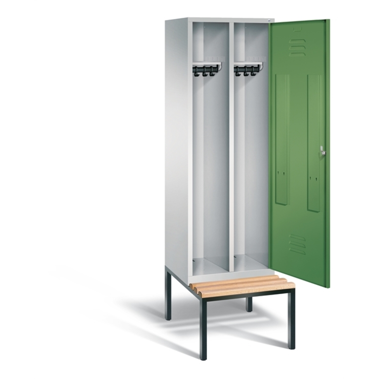 Stahl-Garderobenschrank Classic, als Straßen- und Berufskleidungsschrank, 2 Abteile für 1 Person, Abteilbreite 300 mm, 1 Tür über 2 Abteile, Korpus aus stabiler Stahlkonstruktion mit hochwertiger Einbrennbeschichtung für hohe UV- und Korrosionsbeständigkeit, innen je Abteil 1 Ablageboden darunter 1 stabile Garderobenstange aus Ovalprofil mit 3 verdrehsicheren Schiebehaken, Schrankboden hinten mit Lüftungsöffnungen für optimale Luftzirkulation, auf untergebauter Sitzbank, Gestell aus stabilem Vierkant-Stahlrohr 30 x 30 mm, mit verstellbaren Bodengleitern für einfachen Niveauausgleich, 1 Drehriegel für Vorhangschloss, Tür mit Anschlagsdämpfer und mittiger Verstärkung für hohe Stabilität, mit Lüftungschlitzen oben und unten sowie eingestanztem Etikettenrahmen, Türaufhängung in Drehbolzen, 1 Sitzleisten aus Buche-Hartholz, im Profil ca. 60 x 30 mm, allseitig gehobelt, oben abgerundet für guten Sitzkomfort, klarlackiert mit naturgegebenen Farbunterschieden, 1 Maße (H x B x T): 2090 x 610 x 815 mm, Korpus: RAL 7035 Lichtgrau, Türen Stahl: RAL 6011 Resedagrün, Inneneinrichtung: RAL 7035 Lichtgrau, Gestell: RAL 7021 Schwarzgrau