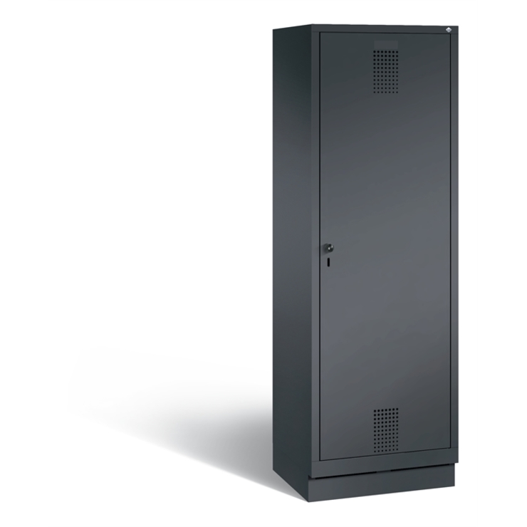 Stahl-Garderobenschrank Evolo, als Straßen- und Berufskleidungsschrank, 2 Abteile für 1 Person, Abteilbreite 300 mm, 1 Tür über 2 Abteile, rechts angeschlagen, Korpus aus stabiler Stahlkonstruktion mit hochwertiger Einbrennbeschichtung für hohe UV- und Korrosionsbeständigkeit, innen je Abteil 1 Ablageboden, darunter 1 stabile Garderobenstange aus Ovalprofil mit 3 verdrehsicheren Schiebehaken, Schrankboden hinten mit großflächigem Luftdurchlass, auf 100 mm hohem Sockel, mit Kunststoffgleitern als praktischer Schrank- und Fußbodenschutz, vorne zurückgesetzt und oberhalb mit Luftdurchlass, 1 Ergonomischer Sicherheits-Drehriegel für Vorhangschloss inkl. Tür-Schutz, Tür mit Anschlagsdämpfer und geschlossenen Seitenprofilen für höchste Stabilität und Einbruchsicherheit, mit reinigungsfreundlichem Belüftungslochbild oben und unten sowie eingeprägtem Etikettenrahmen, Türaufhängung in Drehbolzen, Maße (H x B x T): 1800 x 610 x 500 mm, Korpus: RAL 7021 Schwarzgrau, Türen Stahl: RAL 7021 Schwarzgrau, Inneneinrichtung: RAL 7021 Schwarzgrau