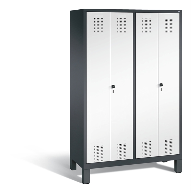 Stahl-Garderobenschrank Evolo, als Straßen- und Berufskleidungsschrank, 4 Abteile für 2 Personen, Abteilbreite 400 mm, Türen paarweise zueinanderschlagend für gemeinsamen Verschluss, Korpus aus stabiler Stahlkonstruktion mit hochwertiger Einbrennbeschichtung für hohe UV- und Korrosionsbeständigkeit, innen je Doppelabteil 1 durchgehender Ablageboden, darunter je Abteil 1 stabile Garderobenstange aus Ovalprofil mit 3 verdrehsicheren Schiebehaken, Schrankboden hinten mit großflächigem... (mehr)? Papersmart hilft Ihnen, den besten Anbieter für Ihren gesamten Warenkorb zu ermitteln.