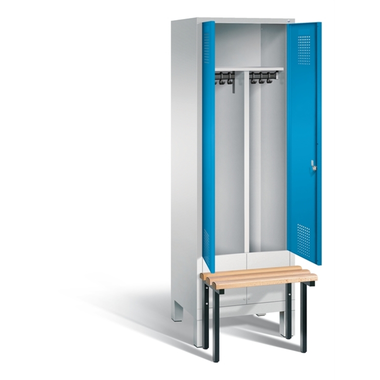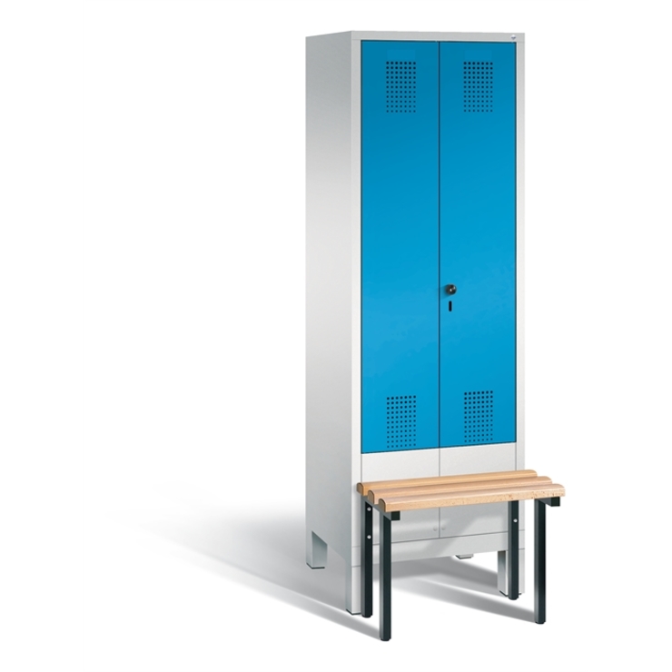 Stahl-Garderobenschrank Evolo, als Straßen- und Berufskleidungsschrank, 2 Abteile für 1 Person, Abteilbreite 300 mm, Türen zueinanderschlagend für gemeinsamen Verschluss, Korpus aus stabiler Stahlkonstruktion mit hochwertiger Einbrennbeschichtung für hohe UV- und Korrosionsbeständigkeit, innen 1 durchgehender Ablageboden, darunter je Abteil 1 stabile Garderobenstange aus Ovalprofil mit 3 verdrehsicheren Schiebehaken, Schrankboden hinten mit großflächigem Luftdurchlass für optimale Luftzirkulation, auf 150 mm hohen Füßen aus Kunststoff für optimalen Korrosionsschutz, mit integrierter Niveauregulierung und Schutzhülsen zur stilvollen Abdeckung der Verstellschrauben, bequem von innen und außen verstellbar, mit vorgebauter Sitzbank (dadurch Türen verkürzt), Gestell aus stabilem Vierkant-Stahlrohr 30 x 30 mm, mit verstellbaren Bodengleitern für einfachen Niveauausgleich, 1 Ergonomischer Sicherheits-Drehriegel für Vorhangschloss inkl. Tür-Schutz, Türen mit Anschlagsdämpfer und geschlossenen Seitenprofilen für höchste Stabilität und Einbruchsicherheit, mit reinigungsfreundlichem Belüftungslochbild oben und unten sowie eingeprägtem Etikettenrahmen, Türaufhängung in Drehbolzen, 1 Sitzleisten aus Buche-Hartholz, im Profil ca. 60 x 30 mm, allseitig gehobelt, oben abgerundet für guten Sitzkomfort, klarlackiert mit naturgegebenen Farbunterschieden, Maße (H x B x T): 1850 x 610 x 815 mm, Korpus: RAL 7035 Lichtgrau, Türen Stahl: RAL 5012 Lichtblau, Füße: RAL 7035 Lichtgrau, Inneneinrichtung: RAL 7021 Schwarzgrau, Gestell: RAL 7021 Schwarzgrau