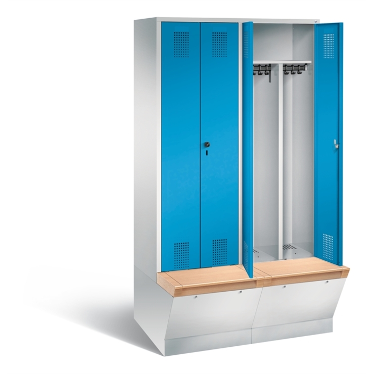 Stahl-Garderobenschrank Evolo, als Straßen- und Berufskleidungsschrank, 4 Abteile für 2 Personen, Abteilbreite 300 mm, Türen paarweise zueinanderschlagend für gemeinsamen Verschluss, Korpus aus stabiler Stahlkonstruktion mit hochwertiger Einbrennbeschichtung für hohe UV- und Korrosionsbeständigkeit, innen je Doppelabteil 1 durchgehender Ablageboden, darunter je Abteil 1 stabile Garderobenstange aus Ovalprofil mit 3 verdrehsicheren Schiebehaken, Schrankboden hinten mit großflächigem Luftdurchlass für optimale Luftzirkulation, auf untergebauter Sitz- und Aufbewahrungsbox zur optimalen Nutzung des Stauraumes, mit klappbarer Sitzfläche aus Buche-Massivholz (Verschlussklappe ist nur von Schrankinhaber zu öffnen) und verstellbaren Bodengleitern für einfachen Niveauausgleich, 2 Ergonomische Sicherheits-Drehriegel für Vorhängeschlösser inkl. Tür-Schutz, Türen mit Anschlagsdämpfer und geschlossenen Seitenprofilen für höchste Stabilität und Einbruchsicherheit, mit reinigungsfreundlichem Belüftungslochbild oben und unten sowie eingeprägtem Etikettenrahmen, Türaufhängung in Drehbolzen, 1 Entfall der Füße Maße (H x B x T): 2090 x 1190 x 815 mm, Korpus: RAL 7035 Lichtgrau, Türen: RAL 5012 Lichtblau, Inneneinrichtung: RAL 7021 Schwarzgrau, Aufbewahrungsbox: RAL 7035 Lichtgrau
