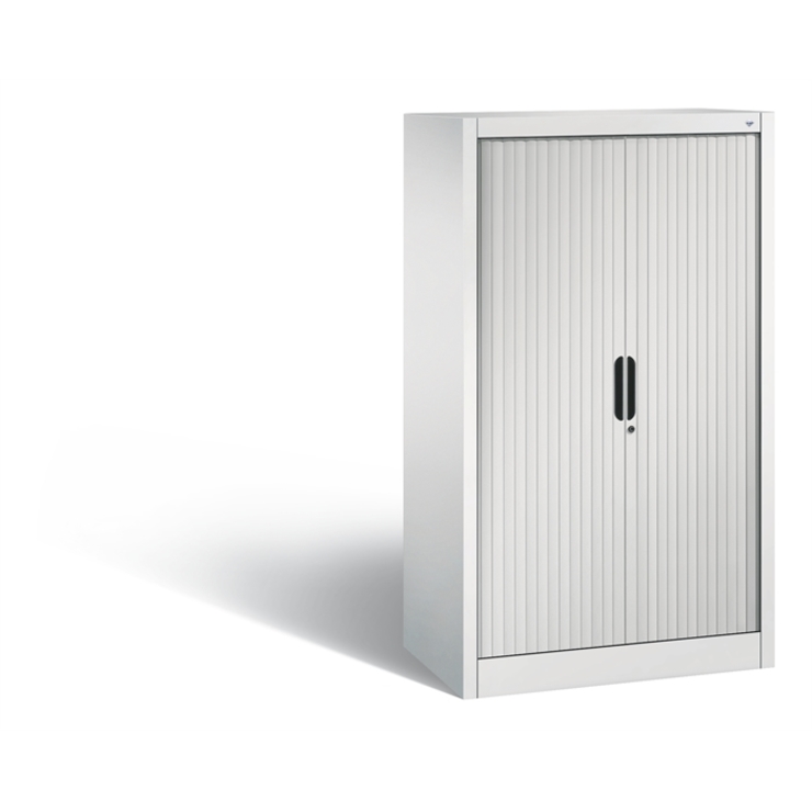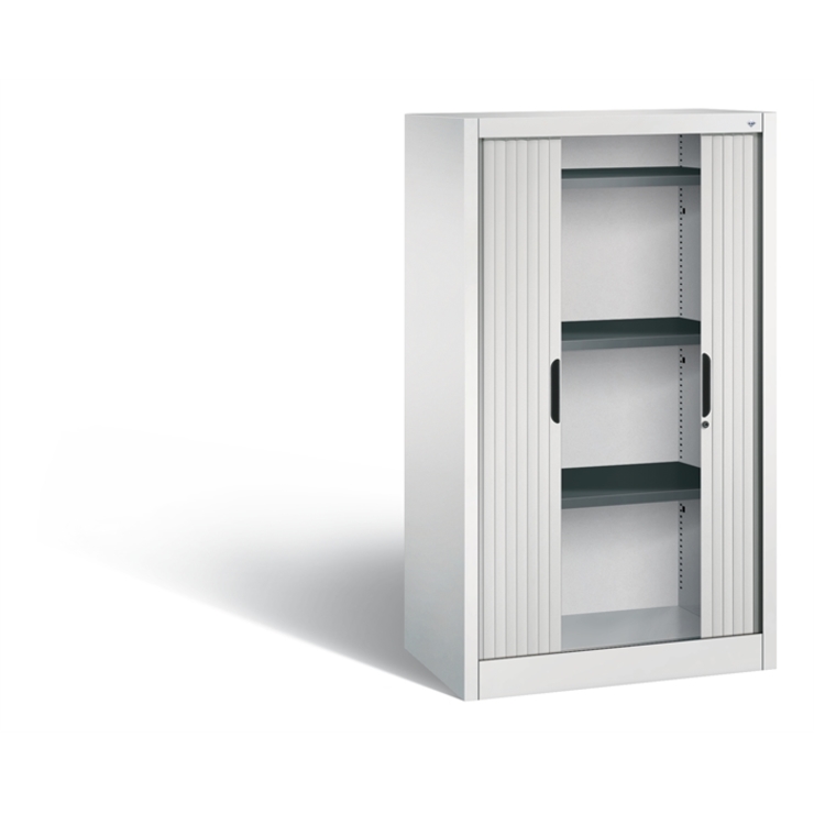 Stahl-Rollladenschrank Omnispace, als Sideboard, Korpus aus stabiler Stahlkonstruktion mit hochwertiger Einbrennbeschichtung für hohe UV-Beständigkeit, mit Kunststoffgleitern als praktischer Schrank- und Fußbodenschutz, hohe Flexibilität der Inneneinrichtung durch Höhenverstellbarkeit im 15 mm Raster, Türen aus durchgehenden, flexiblen Kunststoff- Lamellen (Polypropylen) in Leichtlaufschienen, mit Aluminiumschlossleiste und praktischer Griffmulde für einfache Bedienung, 1 integrierte Niveauregulierung bis 10 mm, bequem von innen justierbar, 1 Drehzylinderschloss mit 2 Schlüsseln, 3 Einlegeböden aus Stahl, lackiert, mit hoher Traglast von 50 kg, Maße (H x B x T): 1345 x 800 x 420 mm, Korpus: RAL 7035 Lichtgrau, Rollladen: RAL 7035 Lichtgrau, Inneneinrichtung: RAL 7021 Schwarzgrau