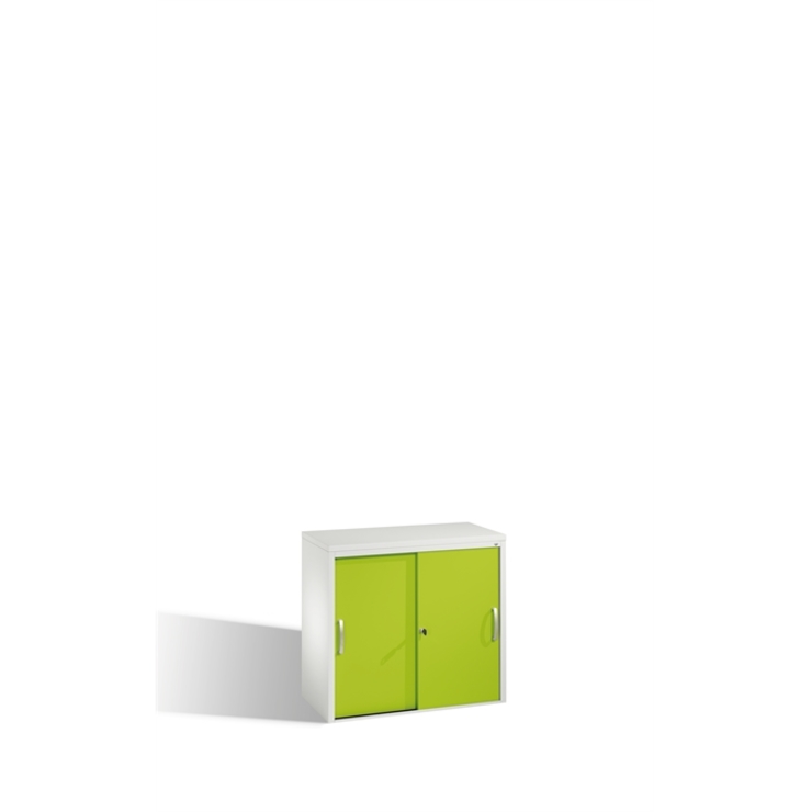 Stahl-Schiebetürenschrank Acurado-2000, als Sideboard, Korpus aus stabiler Stahlkonstruktion mit hochwertiger Einbrennbeschichtung für hohe UV-Beständigkeit, mit Kunststoffgleitern als praktischer Schrank- und Fußbodenschutz, hohe Flexibilität der Inneneinrichtung durch Höhenverstellbarkeit im 15 mm Raster, Türen verstärkt für hohe Stabilität, leichtgängige Bedienung durch Leichtlaufrollen in spezieller Schienenführung, 1 2 Ergonomische Bügelgriffe Ergolock aus Metall für einfache Bedienung, matt vernickelt, 1 Einlegeboden aus Stahl, lackiert, mit hoher Traglast 70 kg, 1 25 mm Abdeckplatte aus direktbeschichteter Spanplatte (DBS) Maße (H x B x T): 720 x 800 x 400 mm, Korpus: RAL 7035 Lichtgrau, Türen: 1108060 RDS Viridingrün, Inneneinrichtung: RAL 7035 Lichtgrau, Abdeckplatte DBS: Dekor Hellgrau