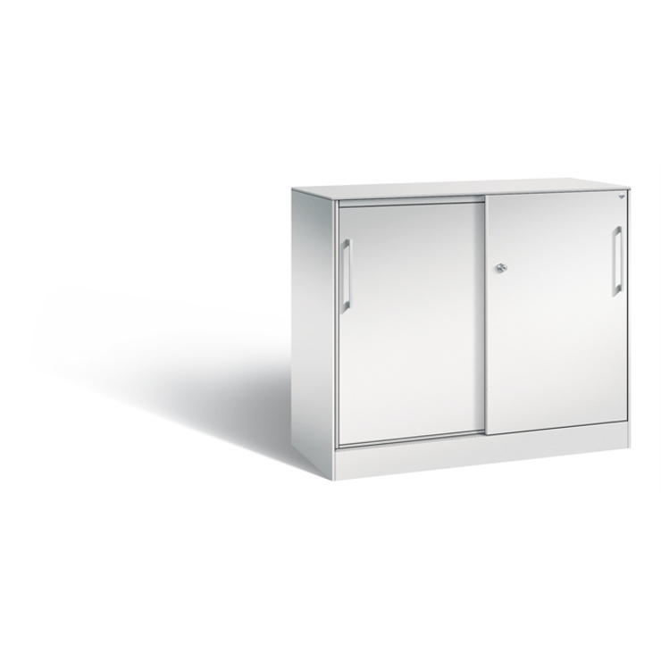 Stahl-Schiebetürenschrank Asisto, Korpus aus stabiler Stahlkonstruktion mit filigraner Kantenoptik und hochwertiger Einbrennbeschichtung für hohe UV-Beständigkeit, mit integrierter Niveauregulierung, bequem von innen bedienbar, hohe Flexibilität der Inneneinrichtung durch Höhenverstellbarkeit im 15 mm Raster, 1 Wechselzylinder matt vernickelt mit 2 Schlüsseln, 2 Ergonomische Design-Bügelgriffe für einfache Bedienung, aus Metall, matt vernickelt, 1 Abdeckplatte aus Stahl, 2 Stahltüren... (mehr)? Papersmart hilft Ihnen, den besten Anbieter für Ihren gesamten Warenkorb zu ermitteln.