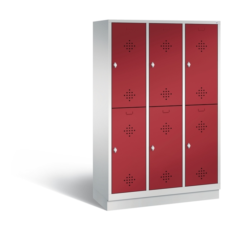 Doppelstöckiger Stahl-Garderobenschrank Evolo, 3 Abteile mit je 2 Fächern, Abteilbreite 300 mm, Korpus aus stabiler Stahlkonstruktion mit hochwertiger Einbrennbeschichtung für hohe UV- und Korrosionsbeständigkeit, innen je Fach 1 stabile Garderobenstange aus Ovalprofil mit 3 verdrehsicheren Schiebehaken, auf 100 mm hohem Sockel, mit Kunststoffgleitern als praktischer Schrank- und Fußbodenschutz, vorne zurückgesetzt, 6 Ergonomische Sicherheits-Drehriegel für Vorhängeschlösser inkl.... (mehr)? Papersmart hilft Ihnen, den besten Anbieter für Ihren gesamten Warenkorb zu ermitteln.