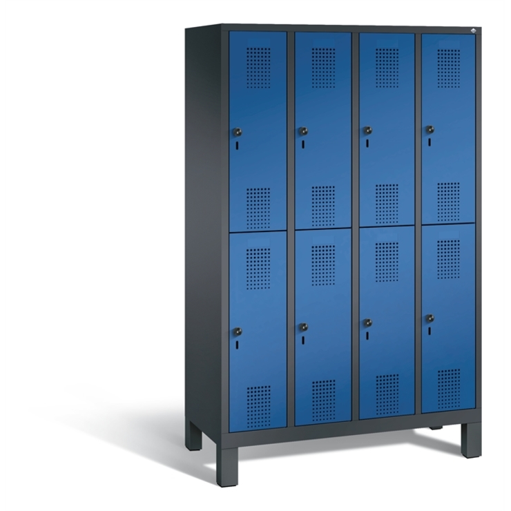 Doppelstöckiger Stahl-Garderobenschrank Evolo, 4 Abteile mit je 2 Fächern, Abteilbreite 300 mm, Korpus aus stabiler Stahlkonstruktion mit hochwertiger Einbrennbeschichtung für hohe UV- und Korrosionsbeständigkeit, innen je Fach 1 stabile Garderobenstange aus Ovalprofil mit 3 verdrehsicheren Schiebehaken, auf 150 mm hohen Füßen aus Kunststoff für erweiterten Korrosionsschutz, mit integrierter Niveauregulierung und Schutzhülsen zur stilvollen Abdeckung der Verstellschrauben, bequem von innen und außen verstellbar, 8 Ergonomische Sicherheits-Drehriegel für Vorhängeschlösser inkl. Tür-Schutz, Türen mit Anschlagsdämpfer und geschlossenen Seitenprofilen für höchste Stabilität und Einbruchsicherheit, mit reinigungsfreundlichem Belüftungslochbild oben und unten sowie eingeprägtem Etikettenrahmen, Türaufhängung in Drehbolzen, Maße (H x B x T): 1850 x 1190 x 500 mm, Korpus: RAL 7021 Schwarzgrau, Türen Stahl: RAL 5010 Enzianblau, Füße: RAL 9005 Tiefschwarz