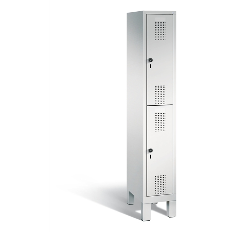 Doppelstöckiger Stahl-Garderobenschrank Evolo, 1 Abteil mit 2 Fächern, Abteilbreite 300 mm, Korpus aus stabiler Stahlkonstruktion mit hochwertiger Einbrennbeschichtung für hohe UV- und Korrosionsbeständigkeit, innen je Fach 1 stabile Garderobenstange aus Ovalprofil mit 3 verdrehsicheren Schiebehaken, auf 150 mm hohen Füßen aus Kunststoff für erweiterten Korrosionsschutz, mit integrierter Niveauregulierung und Schutzhülsen zur stilvollen Abdeckung der Verstellschrauben, bequem von innen und außen verstellbar, 2 Ergonomische Sicherheits-Drehriegel für Vorhängeschlösser inkl. Tür-Schutz, Türen mit Anschlagsdämpfer und geschlossenen Seitenprofilen für höchste Stabilität und Einbruchsicherheit, mit reinigungsfreundlichem Belüftungslochbild oben und unten sowie eingeprägtem Etikettenrahmen, Türaufhängung in Drehbolzen, Maße (H x B x T): 1850 x 320 x 500 mm, Korpus: RAL 7035 Lichtgrau, Türen Stahl: RAL 7035 Lichtgrau, Füße: RAL 7035 Lichtgrau