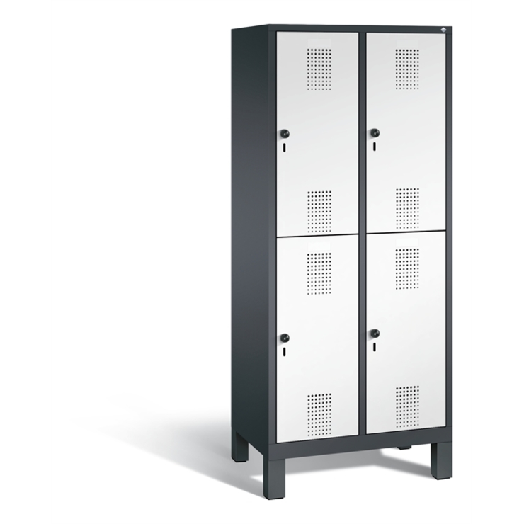 Doppelstöckiger Stahl-Garderobenschrank Evolo, 2 Abteile mit je 2 Fächern, Abteilbreite 400 mm, Korpus aus stabiler Stahlkonstruktion mit hochwertiger Einbrennbeschichtung für hohe UV- und Korrosionsbeständigkeit, innen je Fach 1 stabile Garderobenstange aus Ovalprofil mit 3 verdrehsicheren Schiebehaken, auf 150 mm hohen Füßen aus Kunststoff für erweiterten Korrosionsschutz, mit integrierter Niveauregulierung und Schutzhülsen zur stilvollen Abdeckung der Verstellschrauben, bequem von innen und außen verstellbar, 4 Ergonomische Sicherheits-Drehriegel für Vorhängeschlösser inkl. Tür-Schutz, Türen mit Anschlagsdämpfer und geschlossenen Seitenprofilen für höchste Stabilität und Einbruchsicherheit, mit reinigungsfreundlichem Belüftungslochbild oben und unten sowie eingeprägtem Etikettenrahmen, Türaufhängung in Drehbolzen, Maße (H x B x T): 1850 x 810 x 500 mm, Korpus: RAL 7021 Schwarzgrau, Türen Stahl: RAL 9016 Verkehrsweiß, Füße: RAL 9005 Tiefschwarz