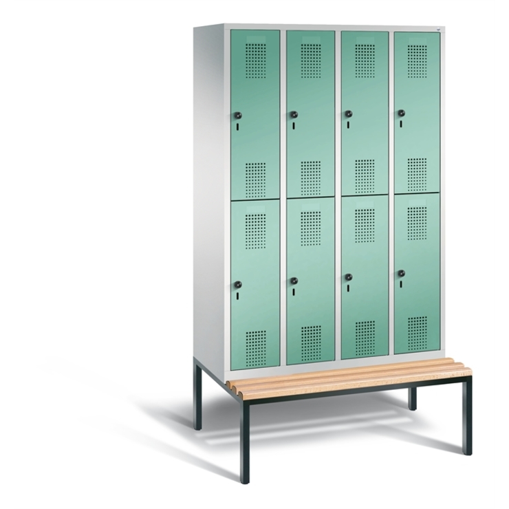 Doppelstöckiger Stahl-Garderobenschrank Evolo, 4 Abteile mit je 2 Fächern, Abteilbreite 300 mm, Korpus aus stabiler Stahlkonstruktion mit hochwertiger Einbrennbeschichtung für hohe UV- und Korrosionsbeständigkeit, innen je Fach 1 Ablageboden, darunter 1 stabile Garderobenstange aus Ovalprofil mit 3 verdrehsicheren Schiebehaken, auf untergebauter Sitzbank, Gestell aus stabilem Vierkant-Stahlrohr 30 x 30 mm, mit verstellbaren Bodengleitern für einfachen Niveauausgleich, 8 Ergonomische Sicherheits-Drehriegel für Vorhängeschlösser inkl. Tür-Schutz, Türen mit Anschlagsdämpfer und geschlossenen Seitenprofilen für höchste Stabilität und Einbruchsicherheit, mit reinigungsfreundlichem Belüftungslochbild oben und unten sowie eingeprägtem Etikettenrahmen, Türaufhängung in Drehbolzen, 1 Sitzleisten aus Buche-Hartholz, im Profil ca. 60 x 30 mm, allseitig gehobelt, oben abgerundet für guten Sitzkomfort, klarlackiert mit naturgegebenen Farbunterschieden, 1 Maße (H x B x T): 2090 x 1190 x 815 mm, Korpus: RAL 7035 Lichtgrau, Türen Stahl: RAL 6027 Lichtgrün, Gestell: RAL 7021 Schwarzgrau