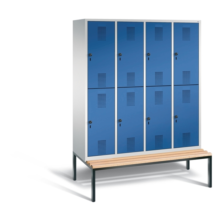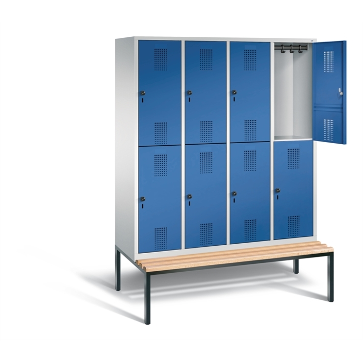 Doppelstöckiger Stahl-Garderobenschrank Evolo, 4 Abteile mit je 2 Fächern, Abteilbreite 400 mm, Korpus aus stabiler Stahlkonstruktion mit hochwertiger Einbrennbeschichtung für hohe UV- und Korrosionsbeständigkeit, innen je Fach 1 Ablageboden, darunter 1 stabile Garderobenstange aus Ovalprofil mit 3 verdrehsicheren Schiebehaken, auf untergebauter Sitzbank, Gestell aus stabilem Vierkant-Stahlrohr 30 x 30 mm, mit verstellbaren Bodengleitern für einfachen Niveauausgleich, 8 Ergonomische Sicherheits-Drehriegel für Vorhängeschlösser inkl. Tür-Schutz, Türen mit Anschlagsdämpfer und geschlossenen Seitenprofilen für höchste Stabilität und Einbruchsicherheit, mit reinigungsfreundlichem Belüftungslochbild oben und unten sowie eingeprägtem Etikettenrahmen, Türaufhängung in Drehbolzen, 1 Sitzleisten aus Buche-Hartholz, im Profil ca. 60 x 30 mm, allseitig gehobelt, oben abgerundet für guten Sitzkomfort, klarlackiert mit naturgegebenen Farbunterschieden, 1 Maße (H x B x T): 2090 x 1590 x 810 mm, Korpus: RAL 7035 Lichtgrau, Türen Stahl: RAL 5010 Enzianblau, Gestell: RAL 7021 Schwarzgrau