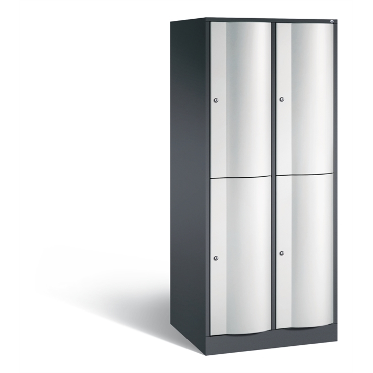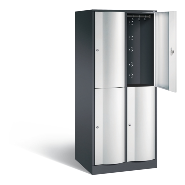 Doppelstöckiger Stahl-Garderobenschrank Resisto, XL, 2 Abteile mit je 2 Fächern, Korpus aus stabiler Stahlkonstruktion mit hochwertiger Einbrennbeschichtung für hohe UV- und Korrosionsbeständigkeit, Spezialtüren aus 1,5 mm Stahl, mit Wölbung nach vorne, absolut stabil und vandalismussicher, mit Anschlagsdämpfer, Türaufhängung durchgängig mit robustem Drehstangen-Scharnier, rechts angeschlagen, innen je Fach 1 stabile Garderobenstange aus Ovalprofil mit 3 verdrehsicheren Schiebehaken, Rückwand mit großflächigem Luftdurchlass und 18 mm Wandabstandshaltern, auf 100 mm hohem Sockel mit 30 mm Niveauregulierung, 4 Drehzylinderschlösser mit 2 Schlüsseln, Schließkreis bis 6000 verschiedene Schließungen, Maße (H x B x T): 1950 x 772 x 640 mm, Korpus: RAL 7021 Schwarzgrau, Türen: RAL 7035 Lichtgrau