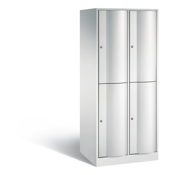 Doppelstöckiger Stahl-Garderobenschrank Resisto, XL, 2 Abteile mit je 2 Fächern, Korpus aus stabiler Stahlkonstruktion mit hochwertiger Einbrennbeschichtung für hohe UV- und Korrosionsbeständigkeit, Spezialtüren aus 1,5 mm Stahl, mit Wölbung nach vorne, absolut stabil und vandalismussicher, mit Anschlagsdämpfer, Türaufhängung durchgängig mit robustem Drehstangen-Scharnier, rechts angeschlagen, innen je Fach 1 stabile Garderobenstange aus Ovalprofil mit 3 verdrehsicheren Schiebehaken, Rückwand mit großflächigem Luftdurchlass und 18 mm Wandabstandshaltern, auf 100 mm hohem Sockel mit 30 mm Niveauregulierung, 4 Drehzylinderschlösser mit 2 Schlüsseln, Schließkreis bis 6000 verschiedene Schließungen, Maße (H x B x T): 1950 x 772 x 640 mm, Korpus: RAL 7035 Lichtgrau, Türen: RAL 7035 Lichtgrau
