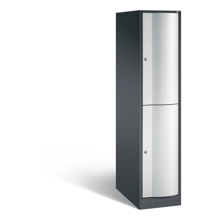 Doppelstöckiger Stahl-Garderobenschrank Resisto, XXL, 1 Abteile mit je 2 Fächern, Korpus aus stabiler Stahlkonstruktion mit hochwertiger Einbrennbeschichtung für hohe UV- und Korrosionsbeständigkeit, Spezialtüren aus 1,5 mm Stahl, mit Wölbung nach vorne, absolut stabil und vandalismussicher, mit Anschlagsdämpfer, Türaufhängung durchgängig mit robustem Drehstangen-Scharnier, rechts angeschlagen, innen je Fach 1 stabile Garderobenstange aus Ovalprofil mit 3 verdrehsicheren Schiebehaken, Rückwand mit großflächigem Luftdurchlass und 18 mm Wandabstandshaltern, auf 100 mm hohem Sockel mit 30 mm Niveauregulierung, 2 Drehzylinderschlösser mit 2 Schlüsseln, Schließkreis bis 6000 verschiedene Schließungen, Maße (H x B x T): 1950 x 396 x 740 mm, Korpus: RAL 7021 Schwarzgrau, Türen: RAL 7035 Lichtgrau