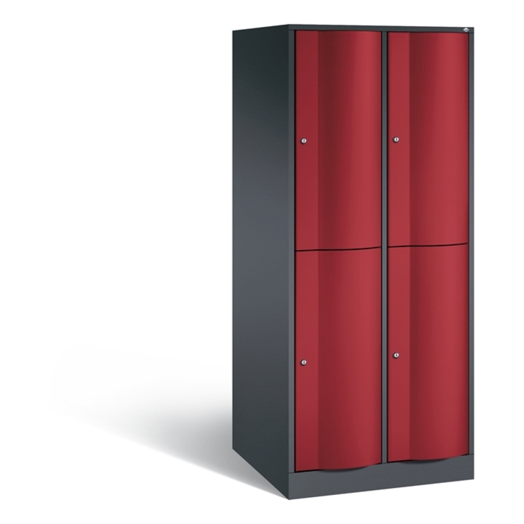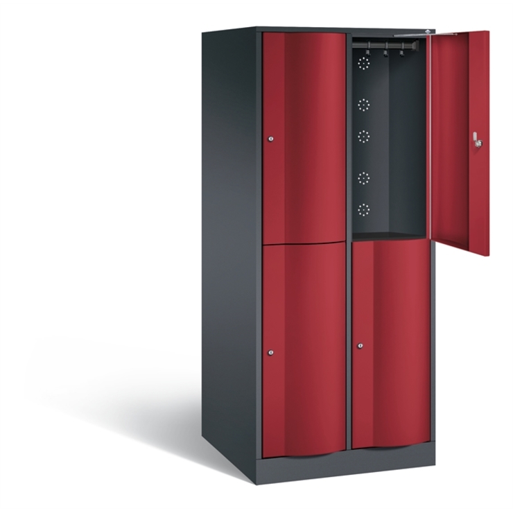 Doppelstöckiger Stahl-Garderobenschrank Resisto, XXL, 2 Abteile mit je 2 Fächern, Korpus aus stabiler Stahlkonstruktion mit hochwertiger Einbrennbeschichtung für hohe UV- und Korrosionsbeständigkeit, Spezialtüren aus 1,5 mm Stahl, mit Wölbung nach vorne, absolut stabil und vandalismussicher, mit Anschlagsdämpfer, Türaufhängung durchgängig mit robustem Drehstangen-Scharnier, rechts angeschlagen, innen je Fach 1 stabile Garderobenstange aus Ovalprofil mit 3 verdrehsicheren Schiebehaken, Rückwand mit großflächigem Luftdurchlass und 18 mm Wandabstandshaltern, auf 100 mm hohem Sockel mit 30 mm Niveauregulierung, 4 Drehzylinderschlösser mit 2 Schlüsseln, Schließkreis bis 6000 verschiedene Schließungen, Maße (H x B x T): 1950 x 772 x 740 mm, Korpus: RAL 7021 Schwarzgrau, Türen: RAL 3003 Rubinrot