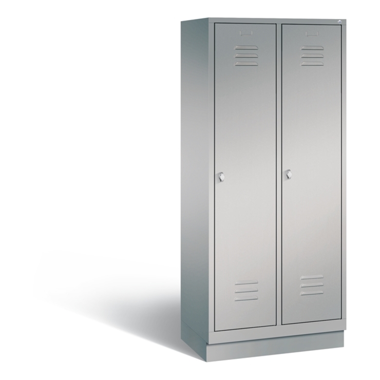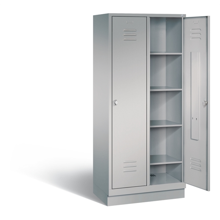 Stahl-Fächerschrank Classic, als Mehrzweckschrank, 2 Abteile, Abteilbreite 400 mm, Korpus aus stabiler Stahlkonstruktion mit hochwertiger Einbrennbeschichtung für hohe UV- und Korrosionsbeständigkeit, innen 4 fest eingebaute Einlegeböden je Abteil, Schrankboden hinten mit Lüftungsöffnungen für optimale Luftzirkulation, auf 100 mm hohem Sockel, mit Kunststoffgleitern als praktischer Schrank- und Fußbodenschutz, vorne zurückgesetzt und oberhalb mit Luftdurchlass, 2 Drehriegel für Vorhängeschlösser, Türen mit Anschlagsdämpfer und mittiger Verstärkung für hohe Stabilität, mit Lüftungschlitzen oben und unten sowie eingestanztem Etikettenrahmen, Türaufhängung in Drehbolzen, Maße (H x B x T): 1800 x 810 x 500 mm, Korpus: RAL 9006 Weißaluminium, Türen Stahl: RAL 9006 Weißaluminium, Inneneinrichtung: RAL 9006 Weißaluminium