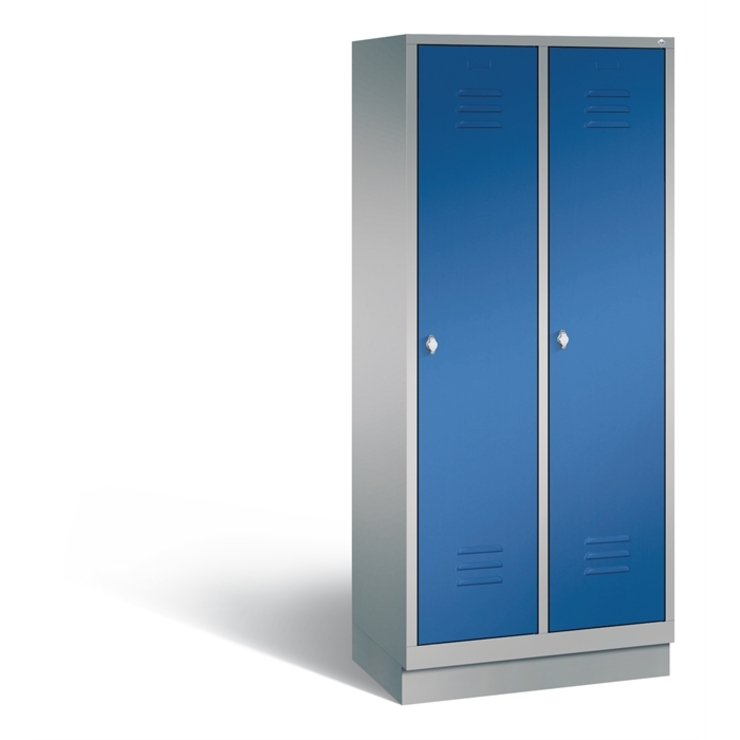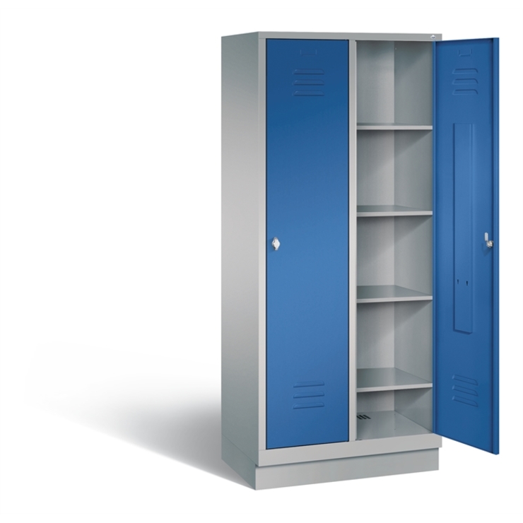 Stahl-Fächerschrank Classic, als Mehrzweckschrank, 2 Abteile, Abteilbreite 400 mm, Korpus aus stabiler Stahlkonstruktion mit hochwertiger Einbrennbeschichtung für hohe UV- und Korrosionsbeständigkeit, innen 4 fest eingebaute Einlegeböden je Abteil, Schrankboden hinten mit Lüftungsöffnungen für optimale Luftzirkulation, auf 100 mm hohem Sockel, mit Kunststoffgleitern als praktischer Schrank- und Fußbodenschutz, vorne zurückgesetzt und oberhalb mit Luftdurchlass, 2 Drehriegel für Vorhängeschlösser, Türen mit Anschlagsdämpfer und mittiger Verstärkung für hohe Stabilität, mit Lüftungschlitzen oben und unten sowie eingestanztem Etikettenrahmen, Türaufhängung in Drehbolzen, Maße (H x B x T): 1800 x 810 x 500 mm, Korpus: RAL 9006 Weißaluminium, Türen Stahl: RAL 5010 Enzianblau, Inneneinrichtung: RAL 9006 Weißaluminium