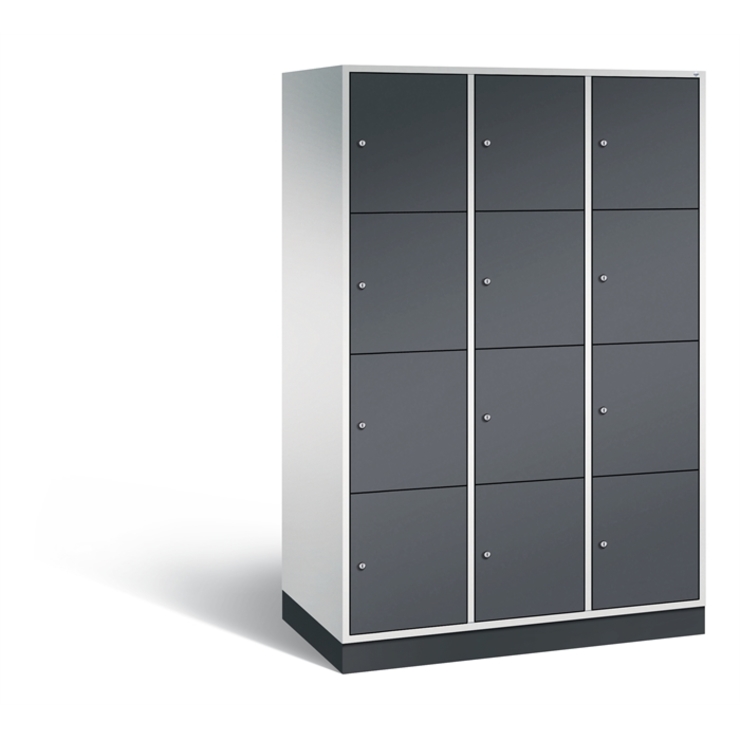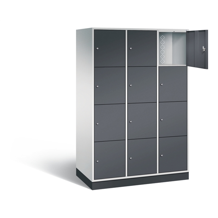 Stahl-Schließfachschrank Intro, XL, 3 Abteile mit 4 Fächern, Abteilbreite 400 mm, Korpus aus stabiler Stahlkonstruktion mit hochwertiger Einbrennbeschichtung für hohe UV- und Korrosionsbeständigkeit, Türen doppelwandig für hohe Stabilität, mit Anschlagsdämpfer, Türaufhängung durchgängig mit robustem Scharnierband, rechts angeschlagen, Rückwand mit großflächigem Luftdurchlass und 18 mm Wandabstandshaltern, auf 100 mm hohem Sockel, 12 Zylinderschlösser mit je 2 Schlüsseln, Schließkreis bis 1000 verschiedene Schließungen, Maße (H x B x T): 1950 x 1220 x 590 mm, Korpus: RAL 7035 Lichtgrau, Türen: RAL 7021 Schwarzgrau, Sockel: RAL 7021 Schwarzgrau