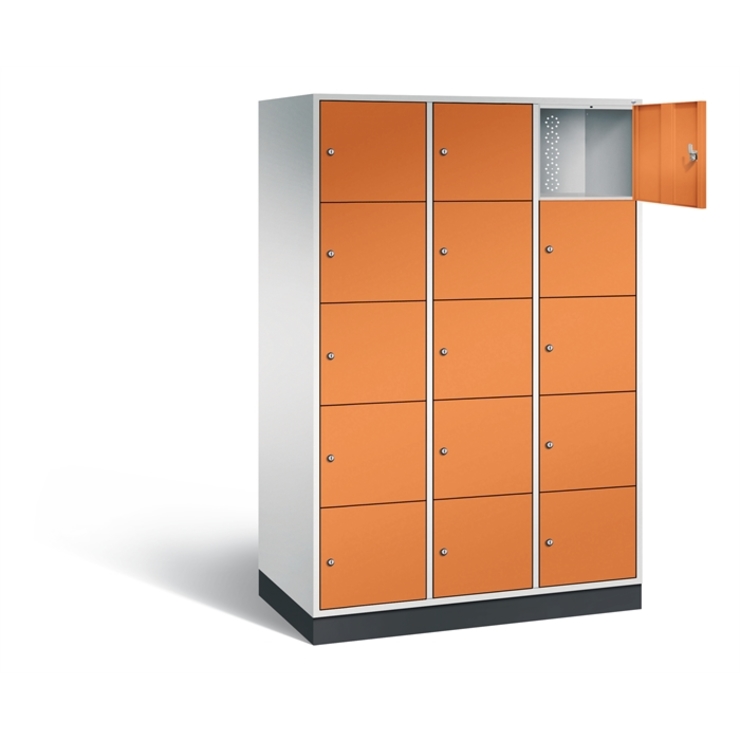Stahl-Schließfachschrank Intro, XL, 3 Abteile mit 5 Fächern, Abteilbreite 400 mm, Korpus aus stabiler Stahlkonstruktion mit hochwertiger Einbrennbeschichtung für hohe UV- und Korrosionsbeständigkeit, Türen doppelwandig für hohe Stabilität, mit Anschlagsdämpfer, Türaufhängung durchgängig mit robustem Scharnierband, rechts angeschlagen, Rückwand mit großflächigem Luftdurchlass und 18 mm Wandabstandshaltern, auf 100 mm hohem Sockel, 15 Zylinderschlösser mit je 2 Schlüsseln, Schließkreis bis 1000 verschiedene Schließungen, Maße (H x B x T): 1950 x 1220 x 590 mm, Korpus: RAL 7035 Lichtgrau, Türen: RAL 2000 Gelborange, Sockel: RAL 7021 Schwarzgrau