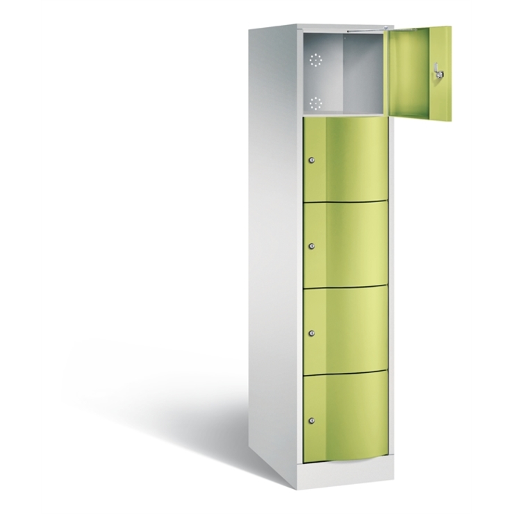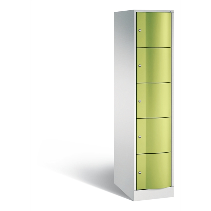 Stahl-Schließfachschrank Resisto, XL, 1 Abteil mit 5 Fächern, Korpus aus stabiler Stahlkonstruktion mit hochwertiger Einbrennbeschichtung für hohe UV- und Korrosionsbeständigkeit, Spezialtüren aus 1,5 mm Stahl, mit Wölbung nach vorne, absolut stabil und vandalismussicher, mit Anschlagsdämpfer, Türaufhängung durchgängig mit robustem Drehstangen- Scharnier, rechts angeschlagen, Rückwand mit großflächigem Luftdurchlass und 18 mm Wandabstandshaltern, auf 100 mm hohem Sockel mit 30 mm Niveauregulierung, 5 Drehzylinderschlösser mit 2 Schlüsseln, Schließkreis bis 6000 verschiedene Schließungen, Maße (H x B x T): 1950 x 396 x 640 mm, Korpus: RAL 7035 Lichtgrau, Türen: 1108060 RDS Viridingrün