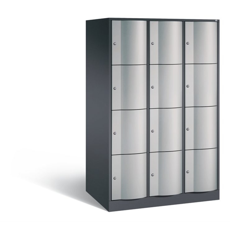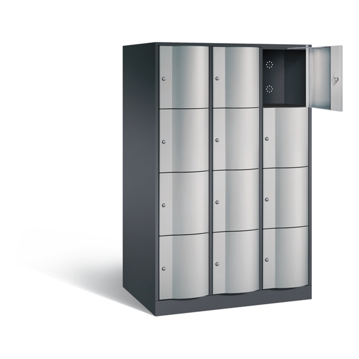 Stahl-Schließfachschrank Resisto, XXL, 3 Abteile mit je 4 Fächern, Korpus aus stabiler Stahlkonstruktion mit hochwertiger Einbrennbeschichtung für hohe UV- und Korrosionsbeständigkeit, Spezialtüren aus 1,5 mm Stahl, mit Wölbung nach vorne, absolut stabil und vandalismussicher, mit Anschlagsdämpfer, Türaufhängung durchgängig mit robustem Drehstangen- Scharnier, rechts angeschlagen, Rückwand mit großflächigem Luftdurchlass und 18 mm Wandabstandshaltern, auf 100 mm hohem Sockel mit 30 mm Niveauregulierung, 12 Drehzylinderschlösser mit 2 Schlüsseln, Schließkreis bis 6000 verschiedene Schließungen, Maße (H x B x T): 1950 x 1148 x 740 mm, Korpus: RAL 7021 Schwarzgrau, Türen: RAL 9006 Weißaluminium