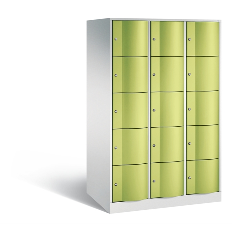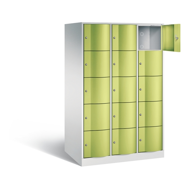 Stahl-Schließfachschrank Resisto, XXL, 3 Abteile mit je 5 Fächern, Korpus aus stabiler Stahlkonstruktion mit hochwertiger Einbrennbeschichtung für hohe UV- und Korrosionsbeständigkeit, Spezialtüren aus 1,5 mm Stahl, mit Wölbung nach vorne, absolut stabil und vandalismussicher, mit Anschlagsdämpfer, Türaufhängung durchgängig mit robustem Drehstangen- Scharnier, rechts angeschlagen, Rückwand mit großflächigem Luftdurchlass und 18 mm Wandabstandshaltern, auf 100 mm hohem Sockel mit 30 mm Niveauregulierung, 15 Drehzylinderschlösser mit 2 Schlüsseln, Schließkreis bis 6000 verschiedene Schließungen, Maße (H x B x T): 1950 x 1148 x 740 mm, Korpus: RAL 7035 Lichtgrau, Türen: 1108060 RDS Viridingrün