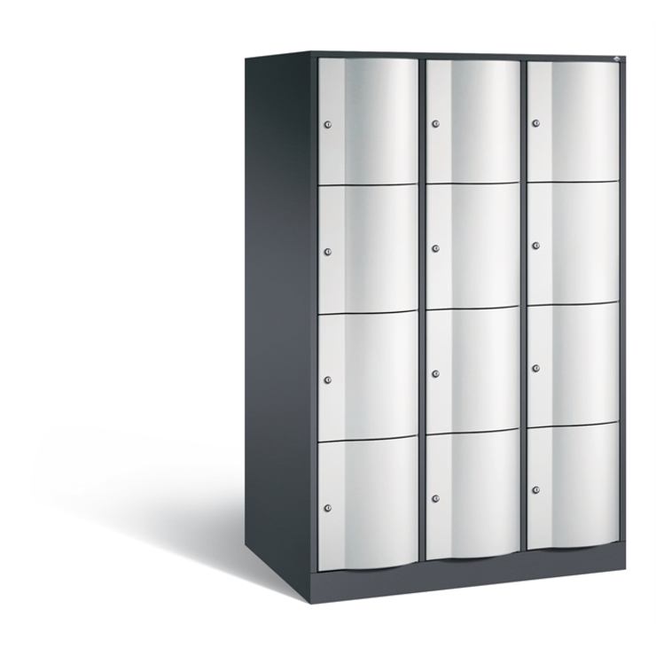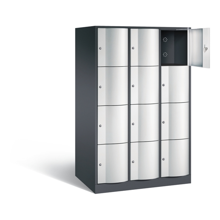 Stahl-Schließfachschrank Resisto, XXL, 3 Abteile mit je 4 Fächern, Korpus aus stabiler Stahlkonstruktion mit hochwertiger Einbrennbeschichtung für hohe UV- und Korrosionsbeständigkeit, Spezialtüren aus 1,5 mm Stahl, mit Wölbung nach vorne, absolut stabil und vandalismussicher, mit Anschlagsdämpfer, Türaufhängung durchgängig mit robustem Drehstangen- Scharnier, rechts angeschlagen, Rückwand mit großflächigem Luftdurchlass und 18 mm Wandabstandshaltern, auf 100 mm hohem Sockel mit 30 mm Niveauregulierung, 12 Drehzylinderschlösser mit 2 Schlüsseln, Schließkreis bis 6000 verschiedene Schließungen, Maße (H x B x T): 1950 x 1148 x 740 mm, Korpus: RAL 7021 Schwarzgrau, Türen: RAL 7035 Lichtgrau