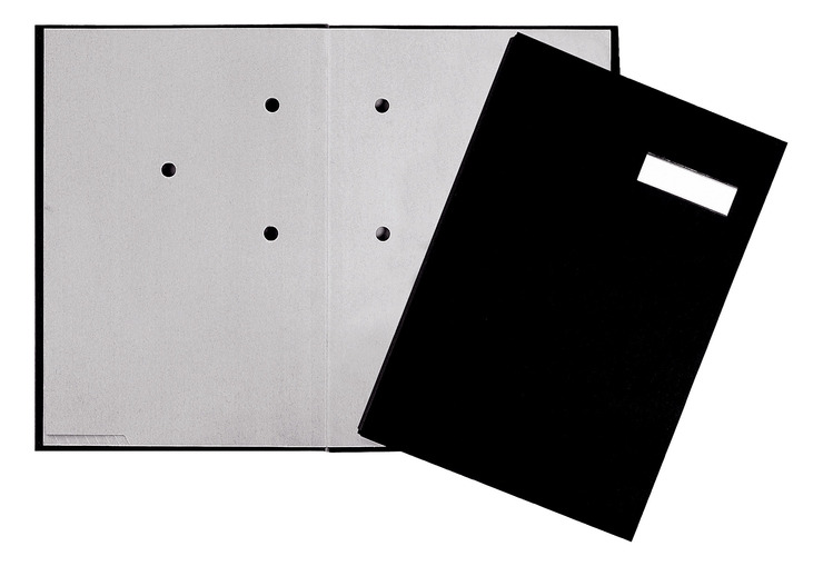 Unterschriftsmappe. 5-teilig. schwarz. Leineneinband. mit dehnbarem Rücken. grauem Löschkarton. 3 Schaulöchern im Buchblock.