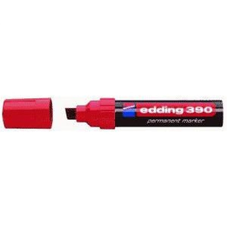 Permanentmarker edding 390. Nachfüllbarer Marker zum Beschriften, Bemalen, Kennzeichnen von fast allen Materialien, auch Metall, Glas, Kunststoff. Permanente, geruchsarme Tinte ohne Zusatz von Toluol / Xylol, wisch- und wasserfest, lichtbeständig. Keilspitze. Kunststoffschaft. Umsteckbare Kappe in Schreibfarbe. Schaftfarbe: schwarz . Strichstärke: ca. 4 - 12 mm. Schreibfarbe : rot.