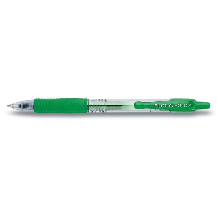Gelschreiber G2-7. Mit Druckmechanik und auswechselbarer Mine Art.Nr. 2606. Spitze aus Edelstahl mit Karbidkugel. Gefüllt mit Geltinte. Schaft und Clip aus Kunststoff. Gummierte Griffzone. Clip, Druckknopf und Griffzone in Schreibfarbe. Strichstärke: 0,4 mm. Schreibfarbe: Grün. Schaftfarbe: transparent.