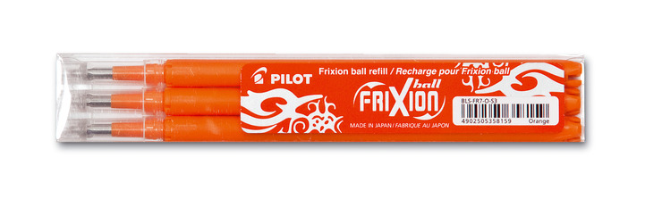Tintenrollermine. Verwendung für Produkt: Frixion Ball 2260. Typbezeichnung der Mine: BLS-FR7-S3. Art der Schreibflüssigkeit: Flüssigtinte. Ausführung Mine: Edelstahlspitze, 0,4 mm, orange. Durch Reibung (reibungswärme >65°C) kann die Schift weggerieben werden und bei Kälte (<15°C) erscheint die Schrift wieder.